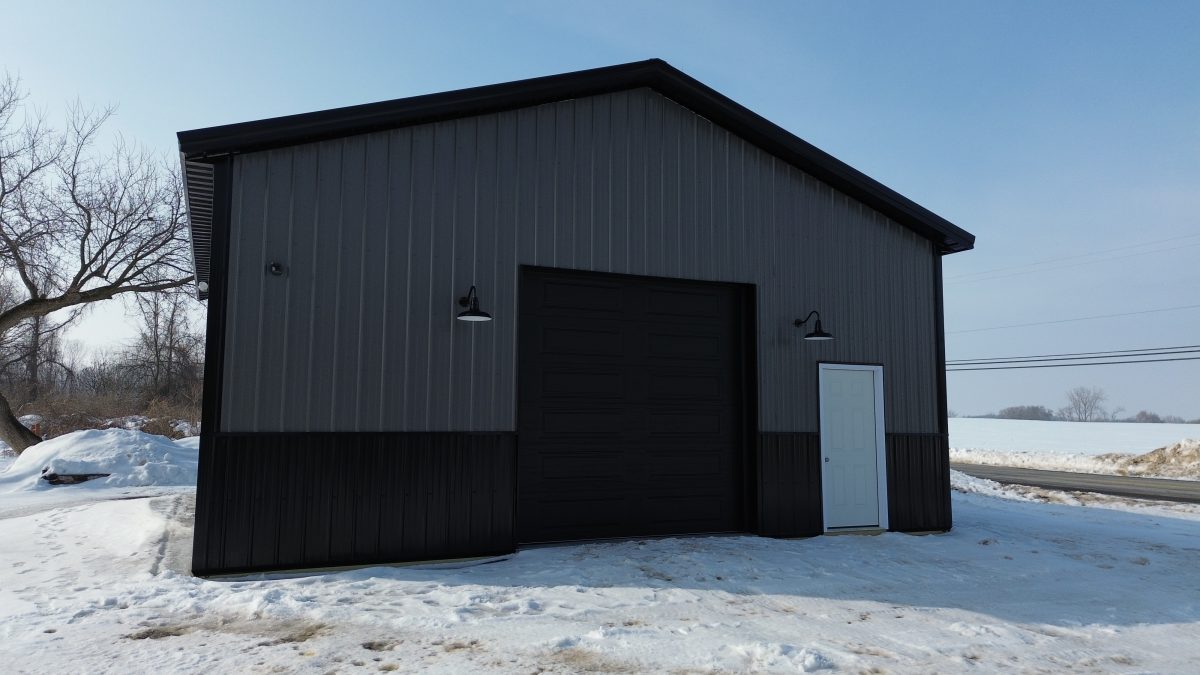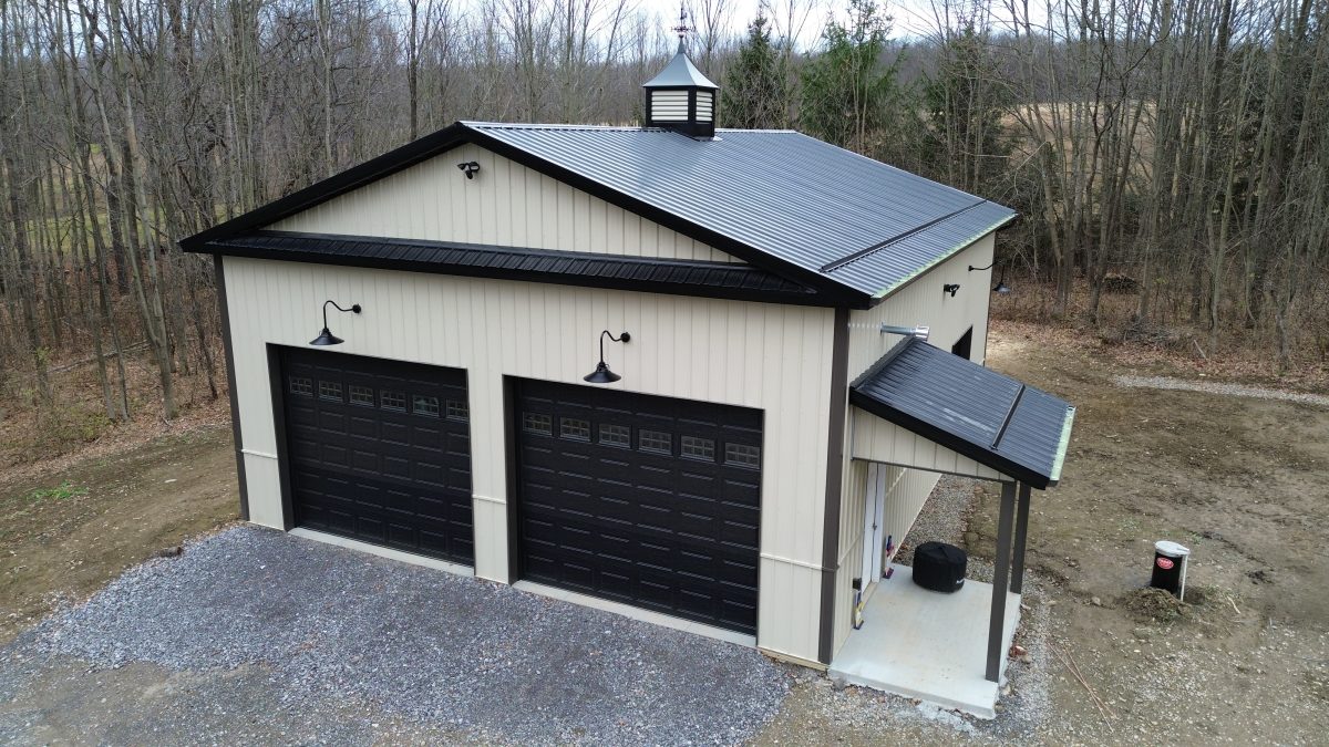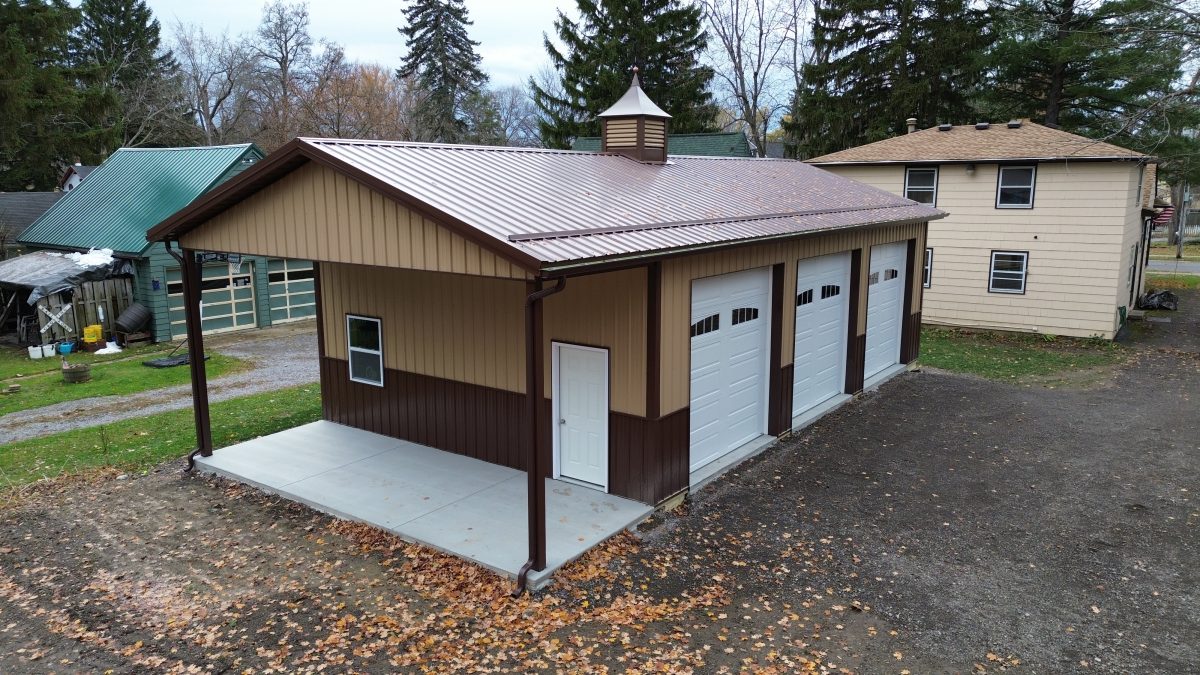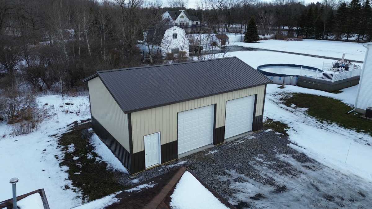 This 40’x60’x16′ pole barn in Lockport, NY, showcases Stately Builders’ commitment to quality and durability in post-frame construction. Built on a concrete pier foundation using Perma-Column® brackets, all wood components are kept above ground, protecting them from moisture and adding to the structure’s longevity. High-quality Steel panels cover the exterior with on edge-placed, overlapped roof purlins, add extra stability. Including two front 14’x14′ and one rear 10’x10′ overhead door openings, along with six 2’x6′ transom windows.