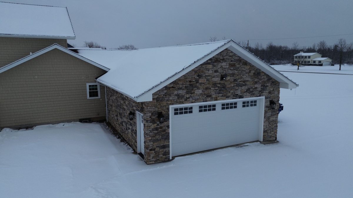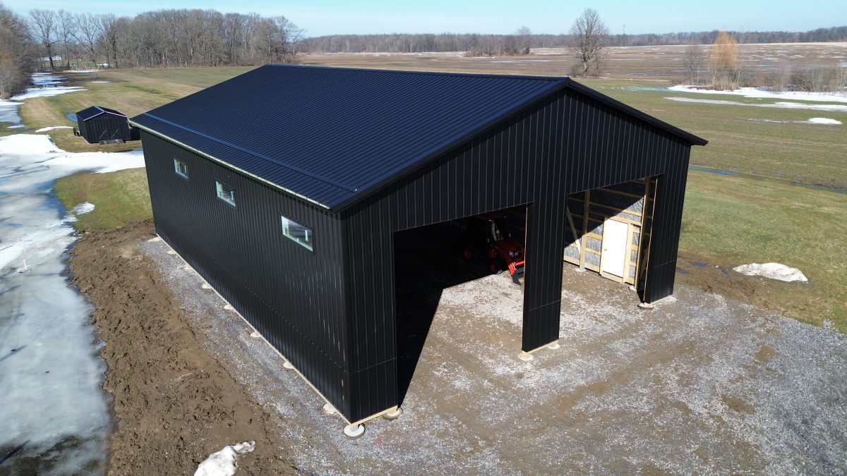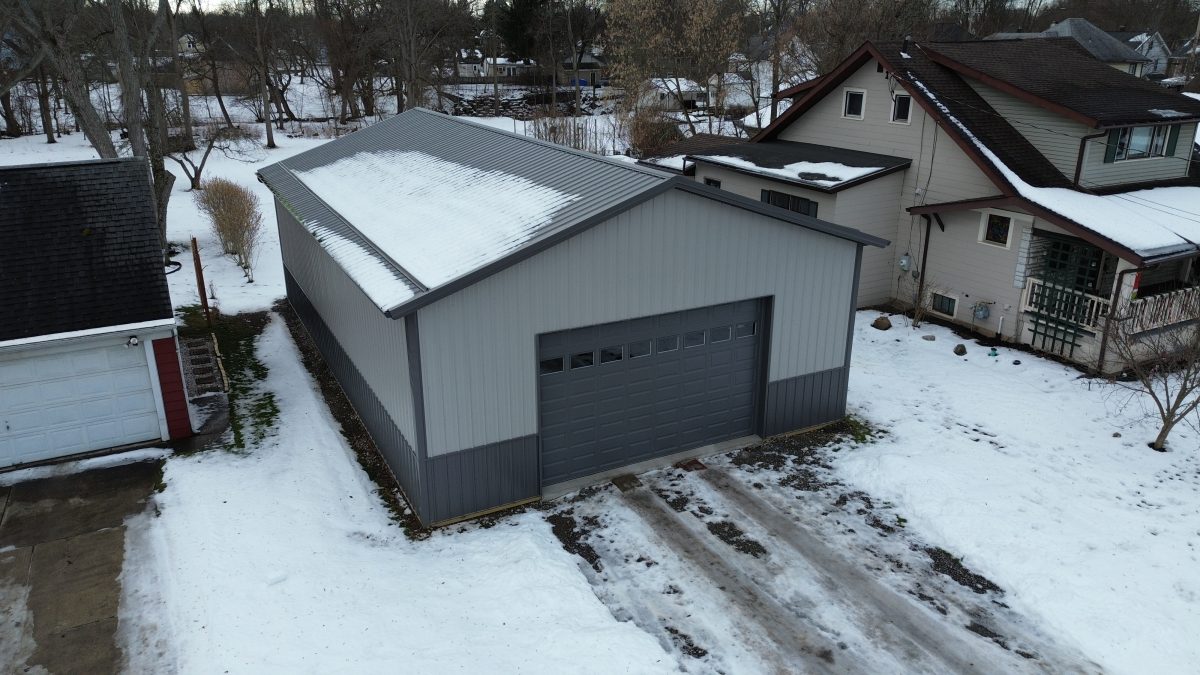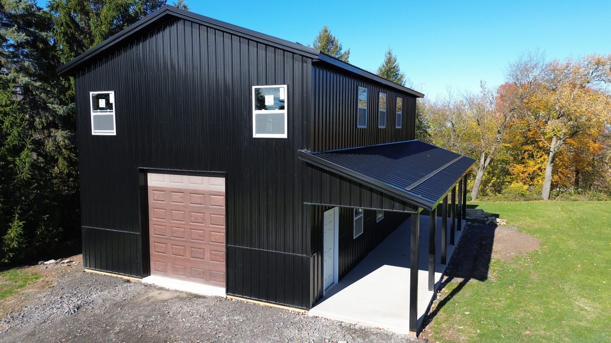 This 40’x60’x16′ pole barn in Lockport, NY, showcases Stately Builders’ commitment to quality and durability in post-frame construction. Built on a concrete pier foundation using Perma-Column® brackets, all wood components are kept above ground, protecting them from moisture and adding to the structure’s longevity. High-quality Steel panels cover the exterior with on edge-placed, overlapped roof purlins, add extra stability. Including two front 14’x14′ and one rear 10’x10′ overhead door openings, along with six 2’x6′ transom windows.