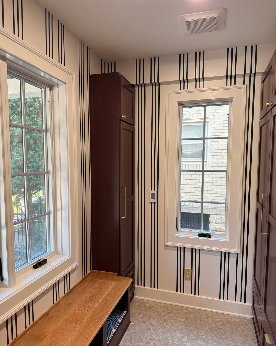 This modern mudroom in Buffalo NY showcases custom built-in cabinets and wood tops. Perfect for all your storage needs. Along with a heated floor to melt snow in the winter and keep feet warm. Interested in a mudroom addition or remodel? Call us today for a free estimate!