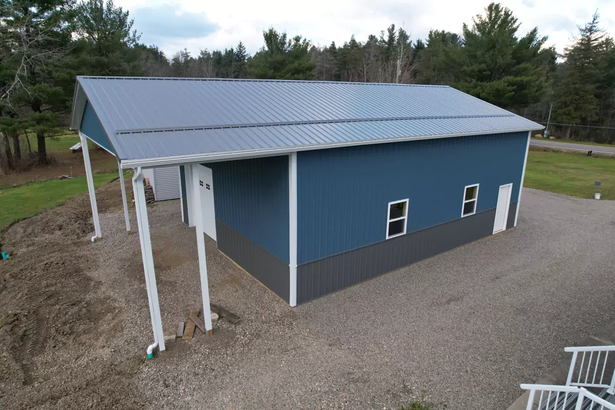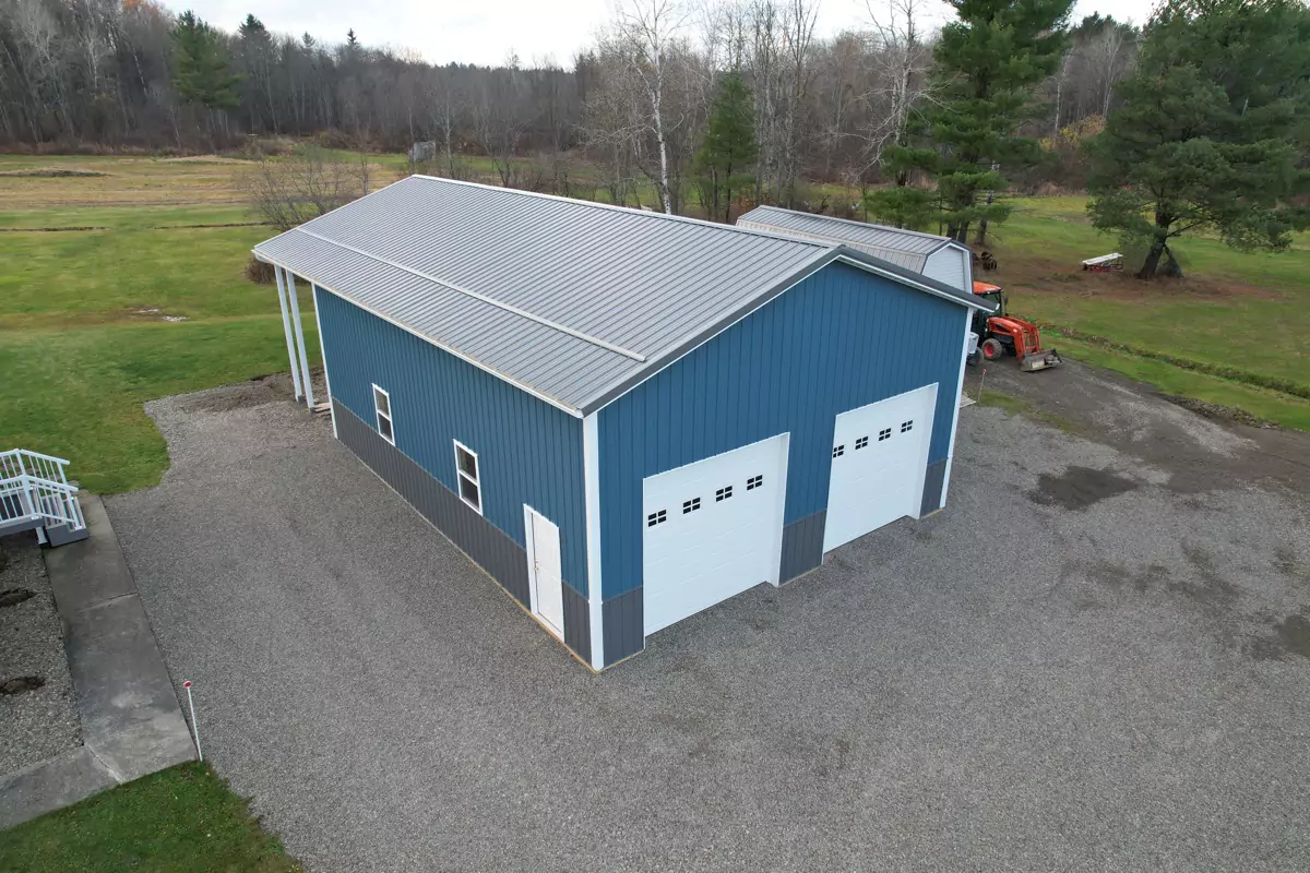 This 40x30 post-frame pole barn, built in Colden, NY, blends smart design with rugged functionality. Set on a solid concrete pier foundation with Perma-Column® brackets, it’s made to last. The structure features three 10’x10’ insulated overhead doors, a covered back porch with wrapped posts, and well-planned ventilation through vented eaves and a ridge cap. Finished with ocean blue steel siding and charcoal wainscoting, it offers a clean, modern look that fits right into a residential setting. Whether it’s for storage, a workshop, or daily use, this barn is built to handle the demands of Western New York weather with ease.