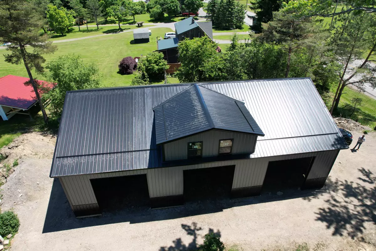 This 60x40 custom pole barn in Elma, NY was built with durability, function, and design in mind. Built to the Stately standard, keeping all timber above-grade using Perma-Column® Sturdi-Wall® brackets, this post-frame structure is designed to last through WNY’s toughest conditions. The barn includes a bold matte black corrugated steel exterior, eight windows, a side entry door, and three framed overhead bays ready for garage doors. A standout reverse gable adds character and additional headroom, making this build both practical and visually appealing.