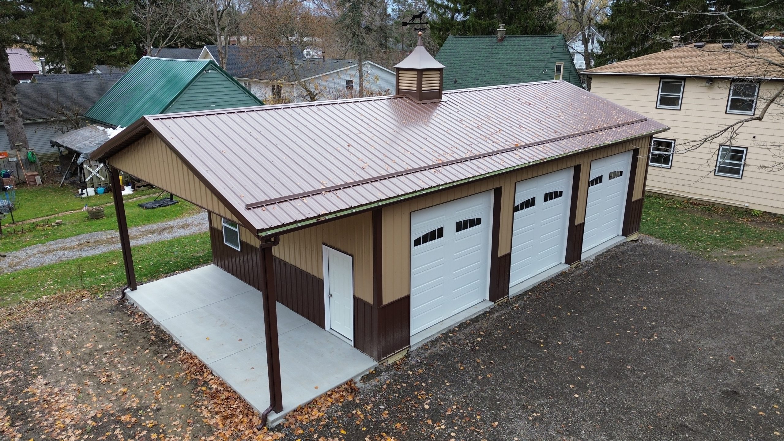This 24x40x12 pole barn in the Village of Alden, NY, showcases the attention to detail Stately Builders puts into every project. Built with Perma-Column® foundations and premium steel siding with color-matched fasteners, this structure is built for longevity. Features including a 3x3 cupola, an extended roofline lean-to, and three 10x10 side by side overhead doors, show why Stately Builders is a trusted choice for post-frame construction in the Buffalo, NY, area.