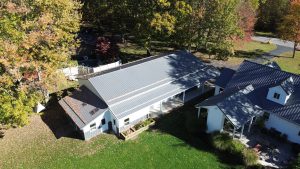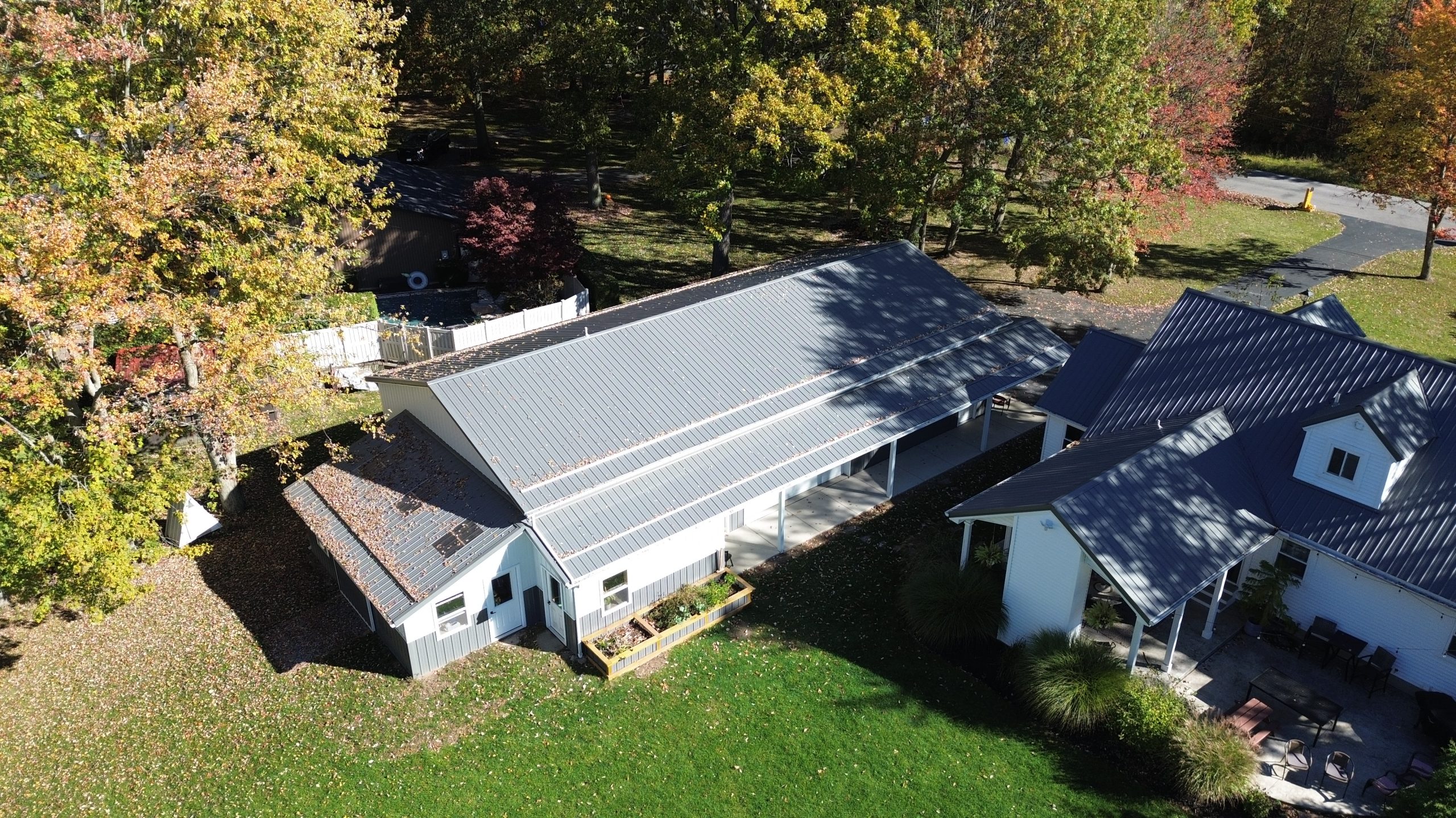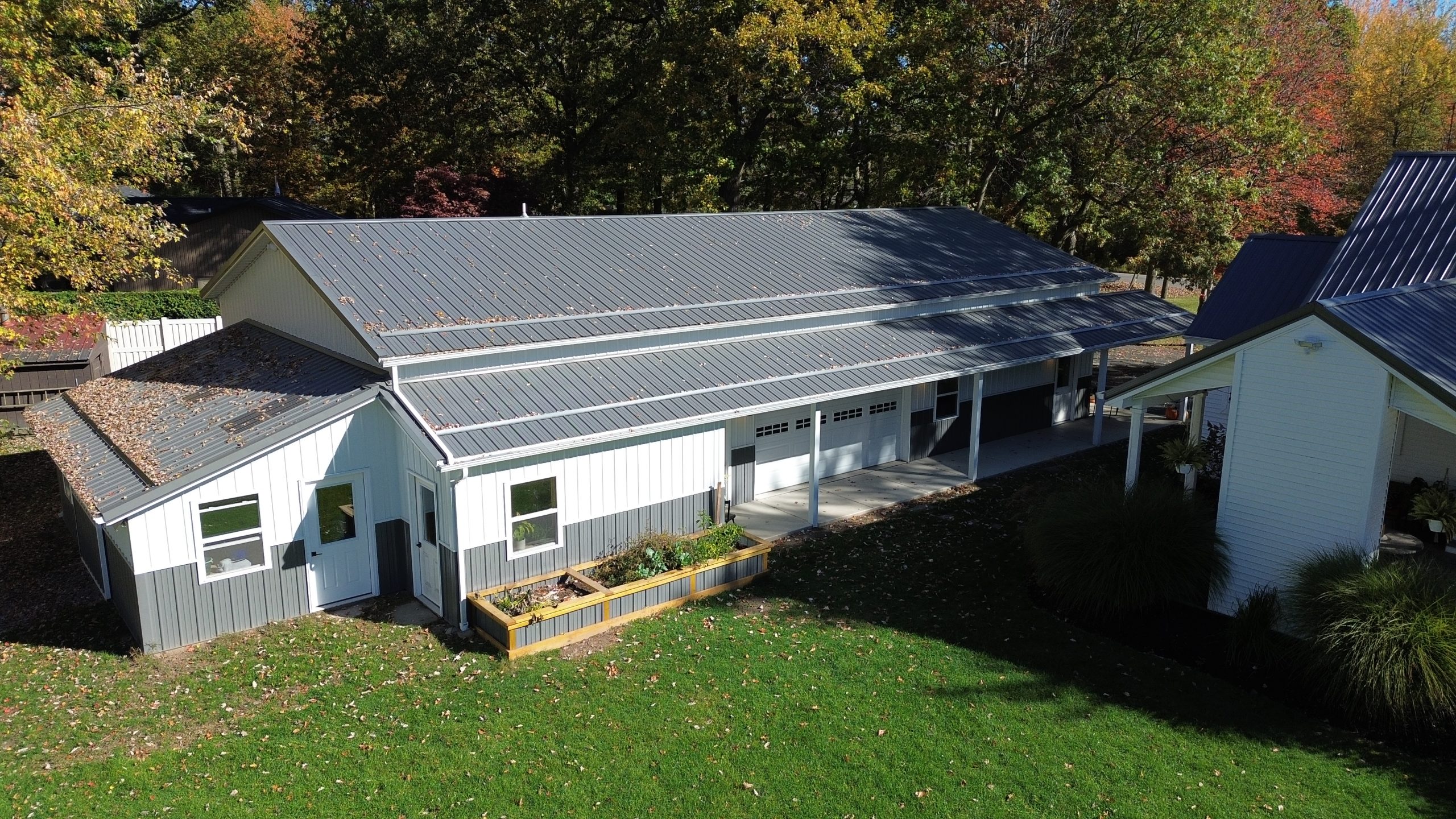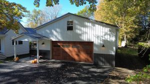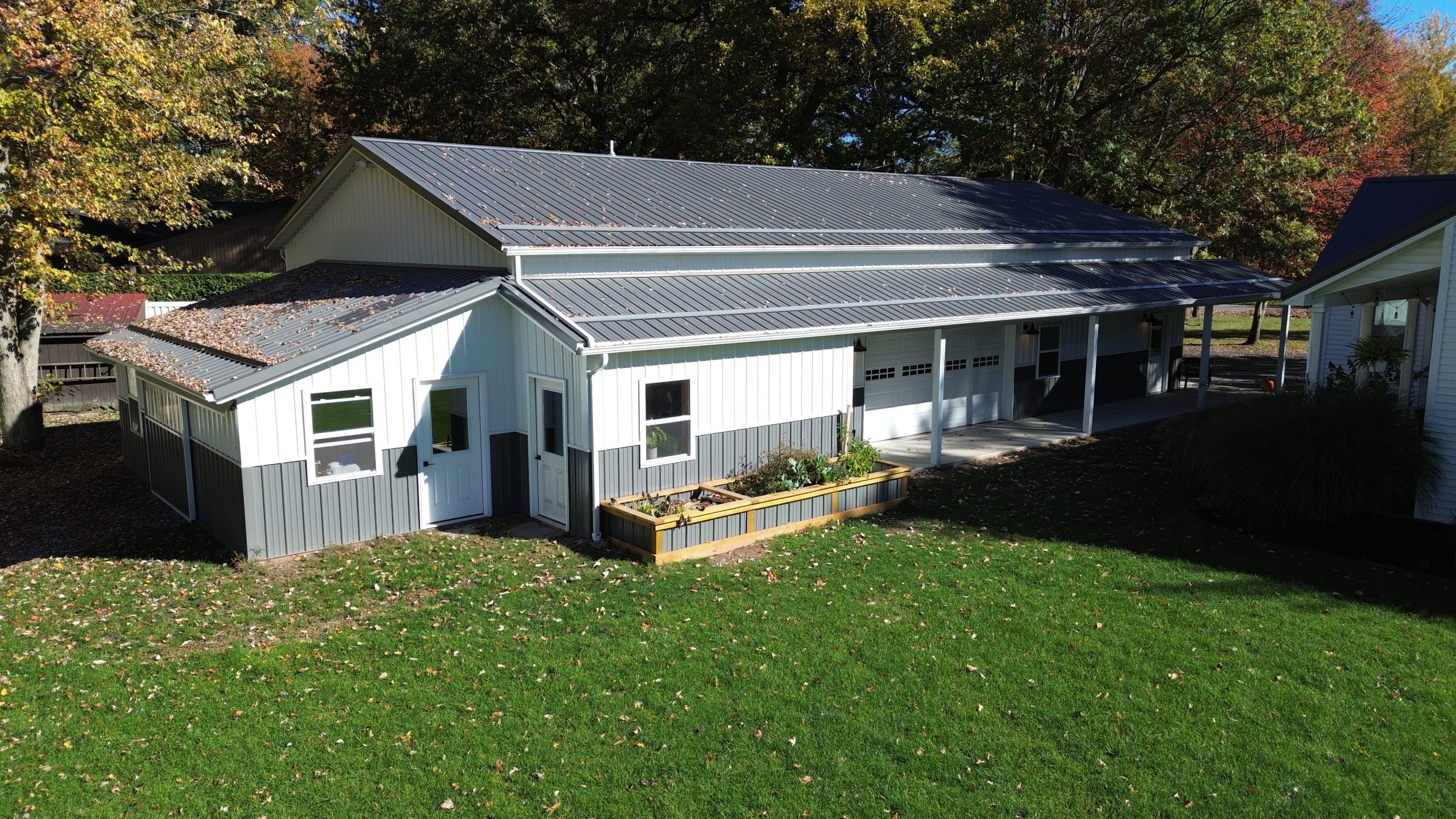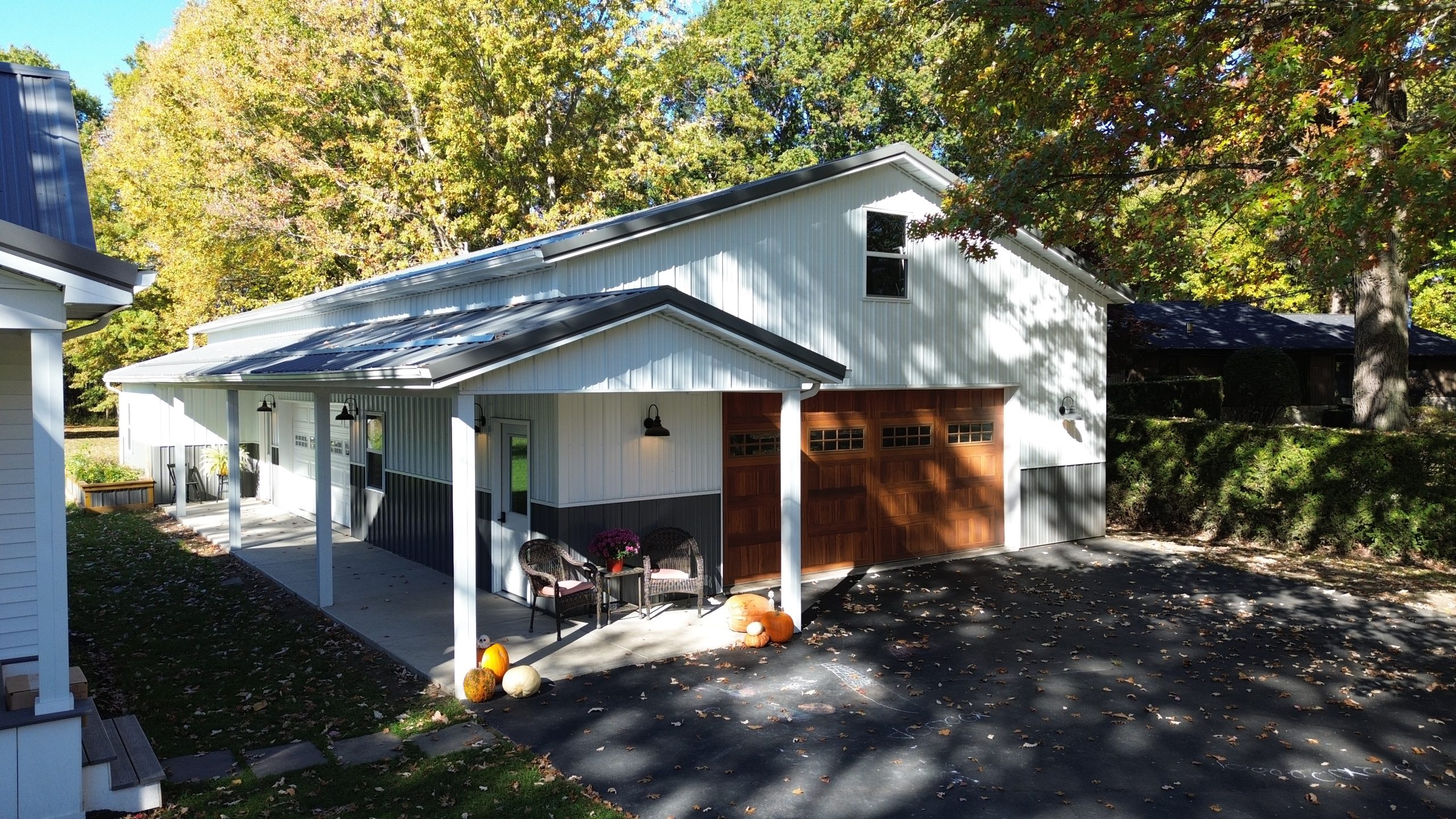 This 32'x64'x12' pole barn garage in Clarence NY showcases a full length 6' lean-to along the side eve wall, a centered front overhead door and a side eve wall overhead door. The 64' length accommodates a front garage space as well as a rear entertainment area. This barn compliments modern touches with practicality