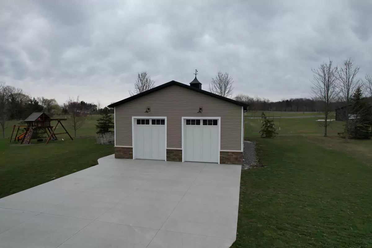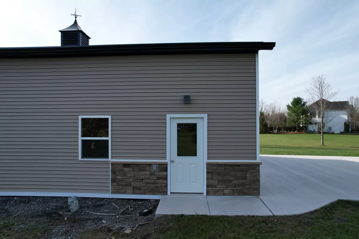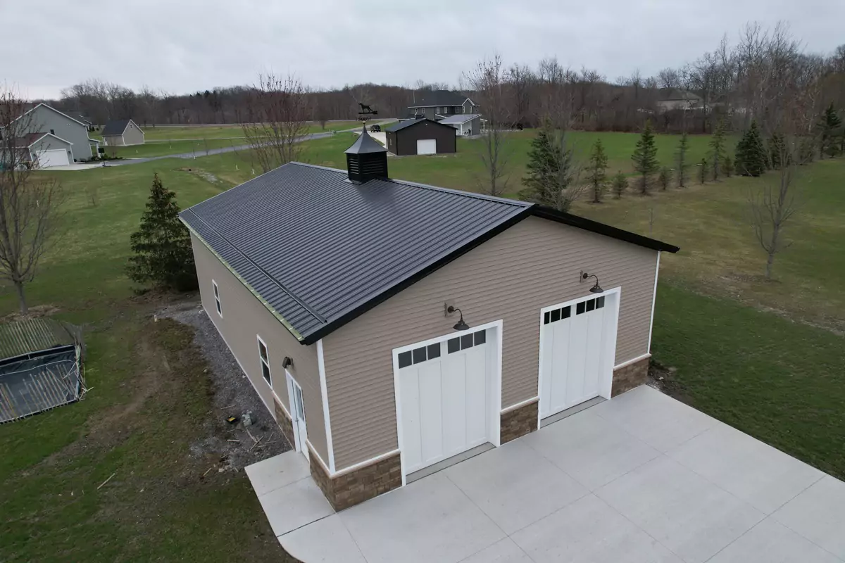 This 30 x 48 x 12 post-frame garage in Elma, NY features a clean, classic exterior with thoughtful details throughout. Built by Stately Pole Barns, the structure includes carriage-style overhead doors, a black metal roof with a decorative cupola, and durable stone wainscoting for added curb appeal. Gooseneck lighting fixtures and custom window placement enhance the look while maintaining functionality. Designed with longevity in mind, this garage was constructed using above-grade laminated columns and Perma-Column® Sturdi-Wall® brackets to keep wood off the ground and protected from moisture. It’s a standout example of Stately’s commitment to quality and custom craftsmanship.