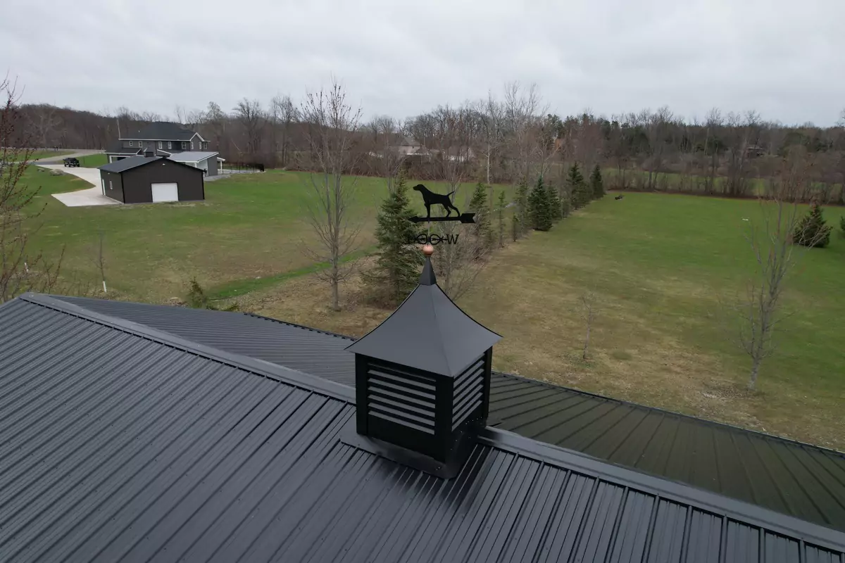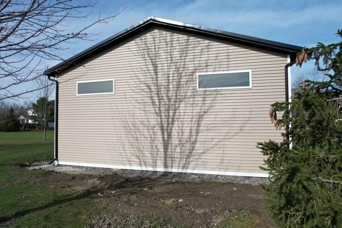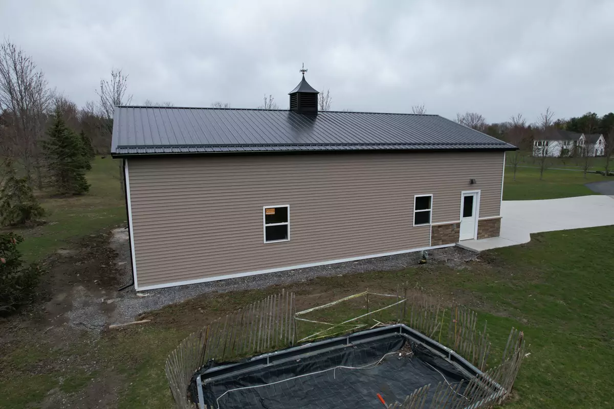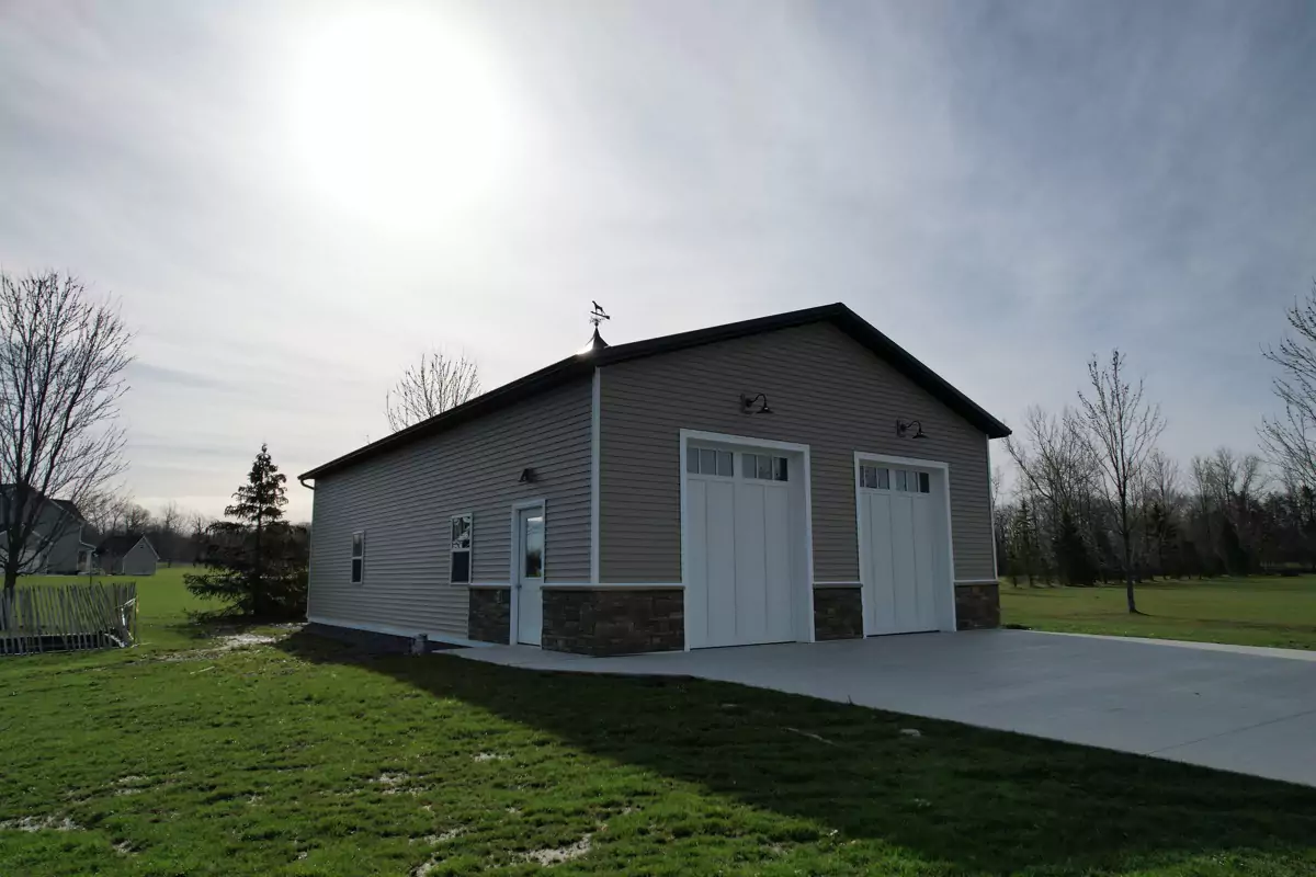 This 30 x 48 x 12 post-frame garage in Elma, NY features a clean, classic exterior with thoughtful details throughout. Built by Stately Pole Barns, the structure includes carriage-style overhead doors, a black metal roof with a decorative cupola, and durable stone wainscoting for added curb appeal. Gooseneck lighting fixtures and custom window placement enhance the look while maintaining functionality. Designed with longevity in mind, this garage was constructed using above-grade laminated columns and Perma-Column® Sturdi-Wall® brackets to keep wood off the ground and protected from moisture. It’s a standout example of Stately’s commitment to quality and custom craftsmanship.