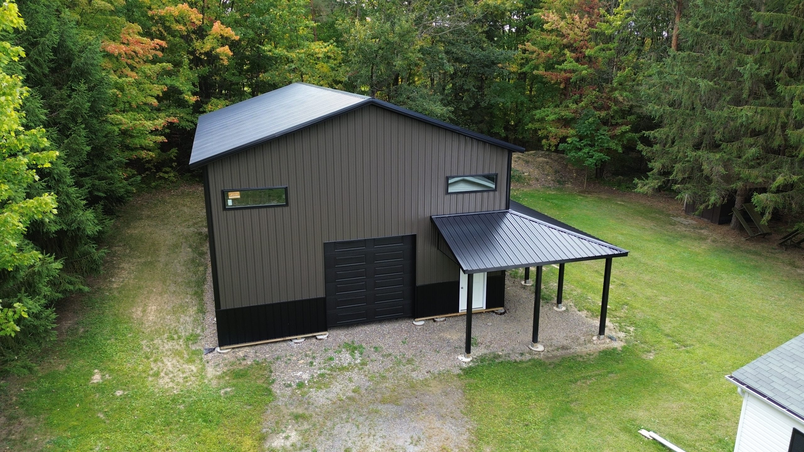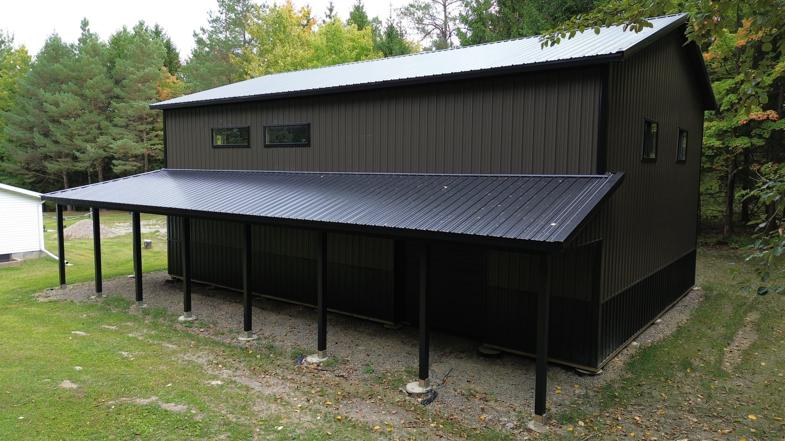 This 32 x 48 x 18 custom pole barn in Forestville, NY, is designed for both style and functionality. Featuring a wrap around lean-to for extra covered space, a rear overhead door for easy access, and both single hung and transom windows. Exterior steel panels and Perma-Column® Sturdi-Wall® anchor brackets ensure lasting durability. This southtowns project perfectly blends custom design with practical use and is a prime example of custom quality from Stately.